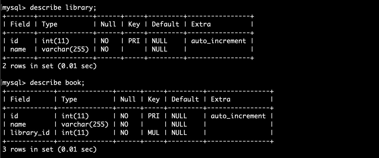 We will use the relationship between the library and books to implement for this example. One library may have many books, one book can only be managed by one library. The relationship is enforced via the library_id foreign key column placed on the book table (the Many side)